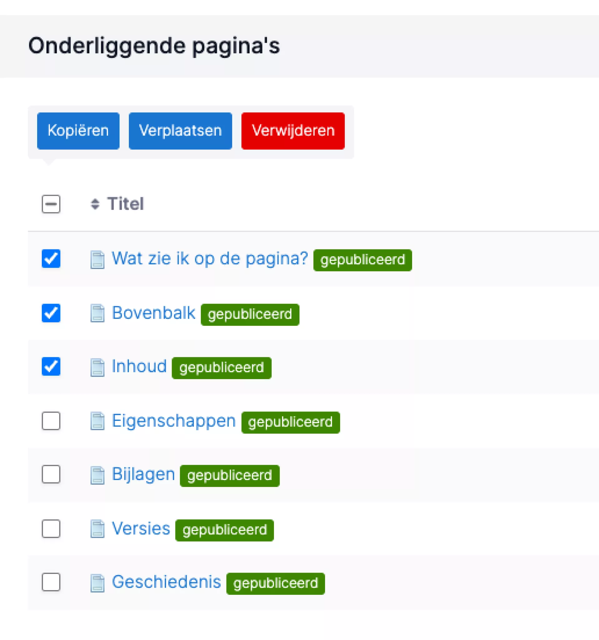 - If you want to quickly delete one or more pages, you can do so by selecting the parent page in the CMS and going to the "Underlying pages" tab. On this tab, you will see all underlying pages with a red button behind them that allows you to delete pages.