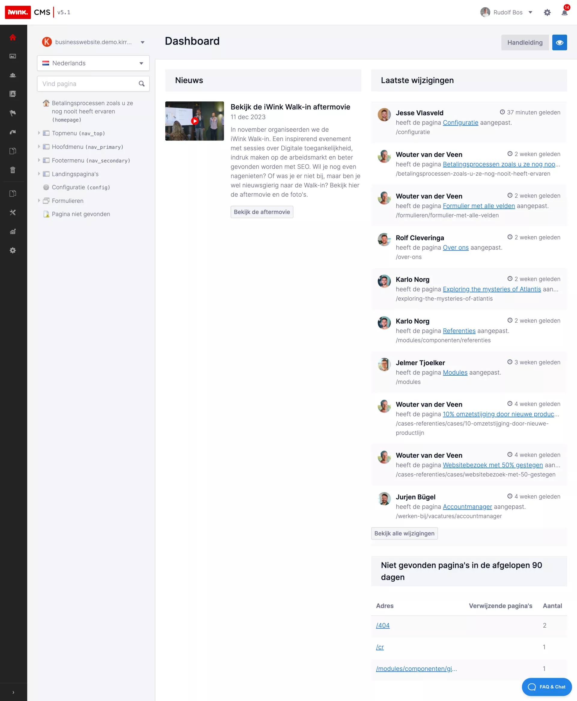 - Timeline: The last modified pages in the CMS with an indication of which user modified this page.