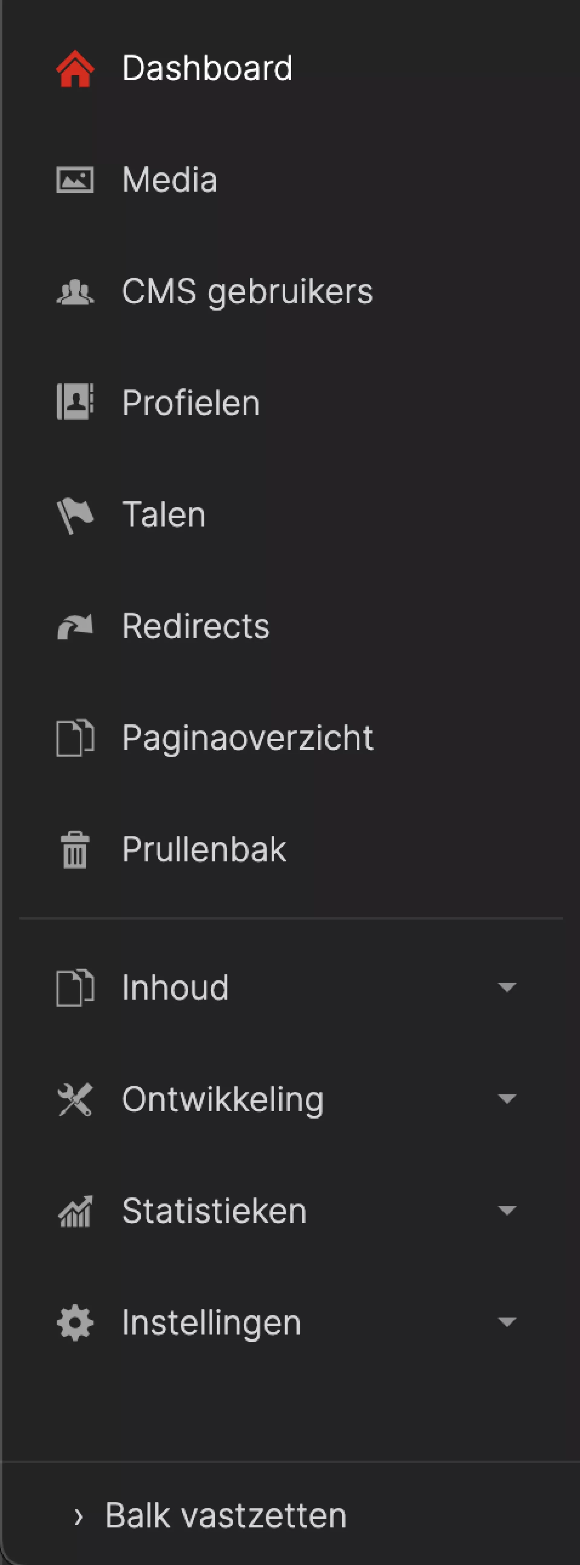 - At the bottom of the module menu you will find a button to display the menu wider. This allows you to directly see the labels of the modules. Making the bar smaller will give you more space if you want to fill content on your website. When you hover over the module menu, the labels are also shown.
