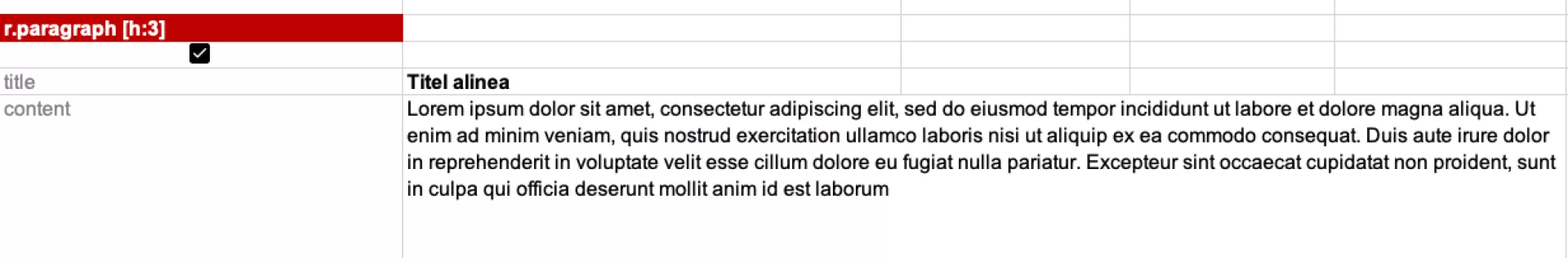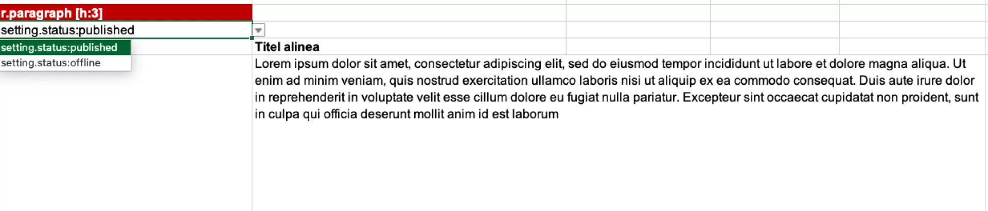 - In de eerste cel onder de aanroep (bijv. r.paragraph), bijvoorbeeld setting.status:published of setting.h:2