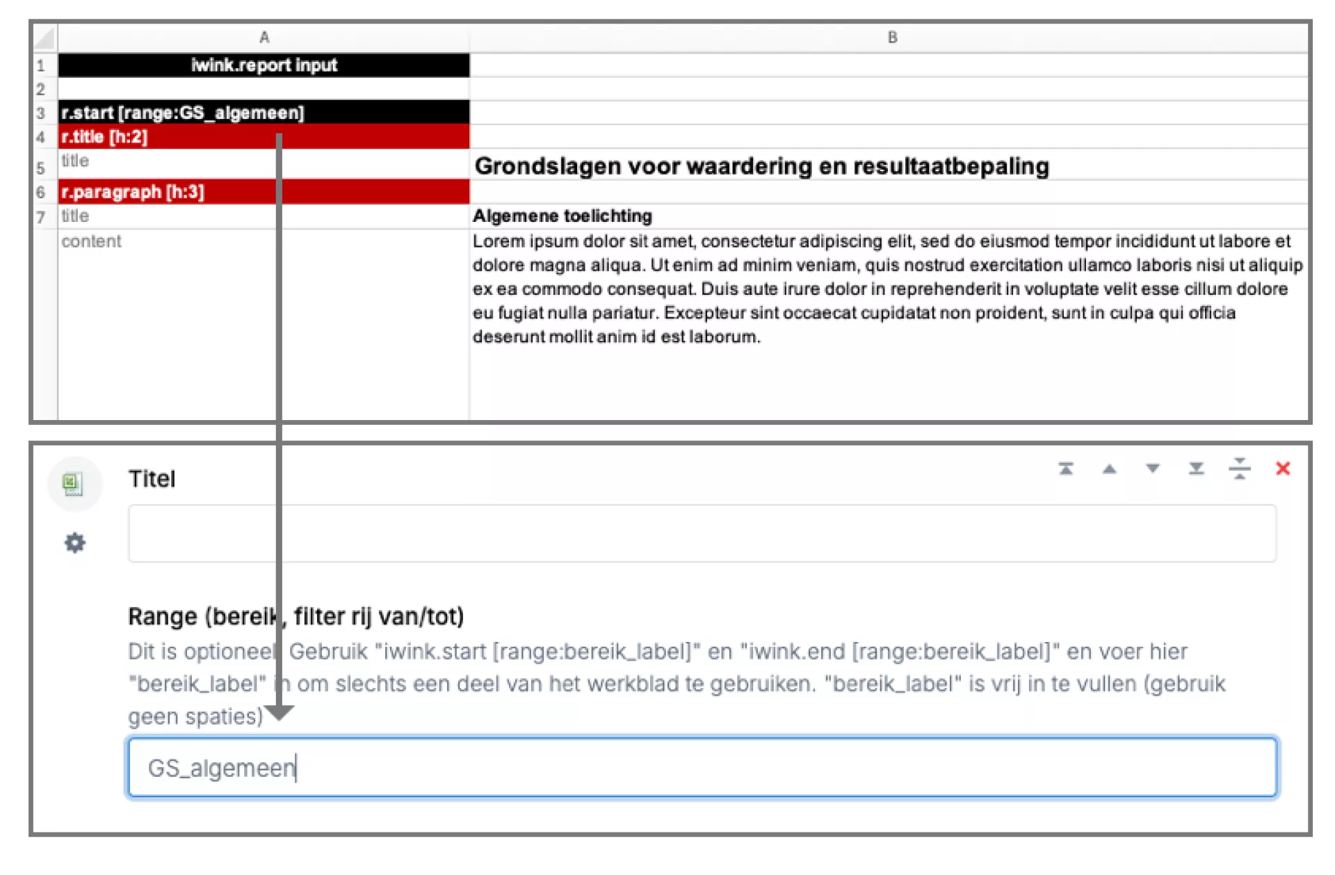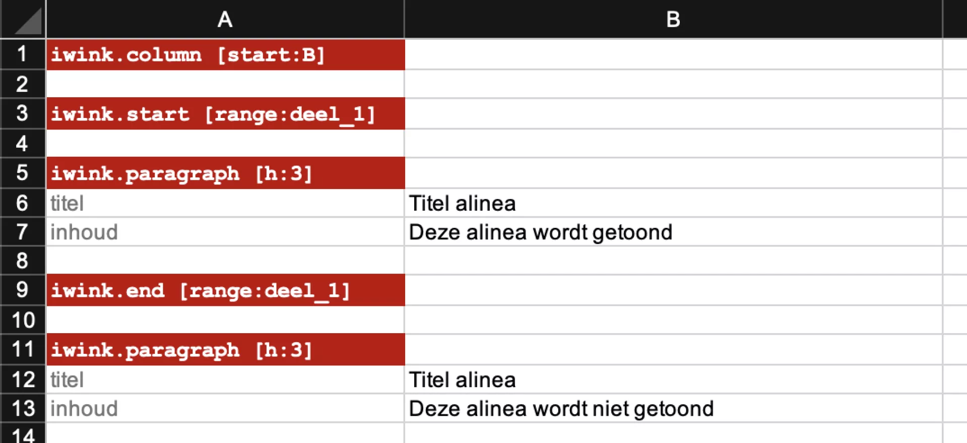 Plaats r.start en r.end in dezelfde kolom als waarin ook de iwink.report codering staat. Alle rijen tussen deze twee sleutels worden meegenomen in de uitlezing.