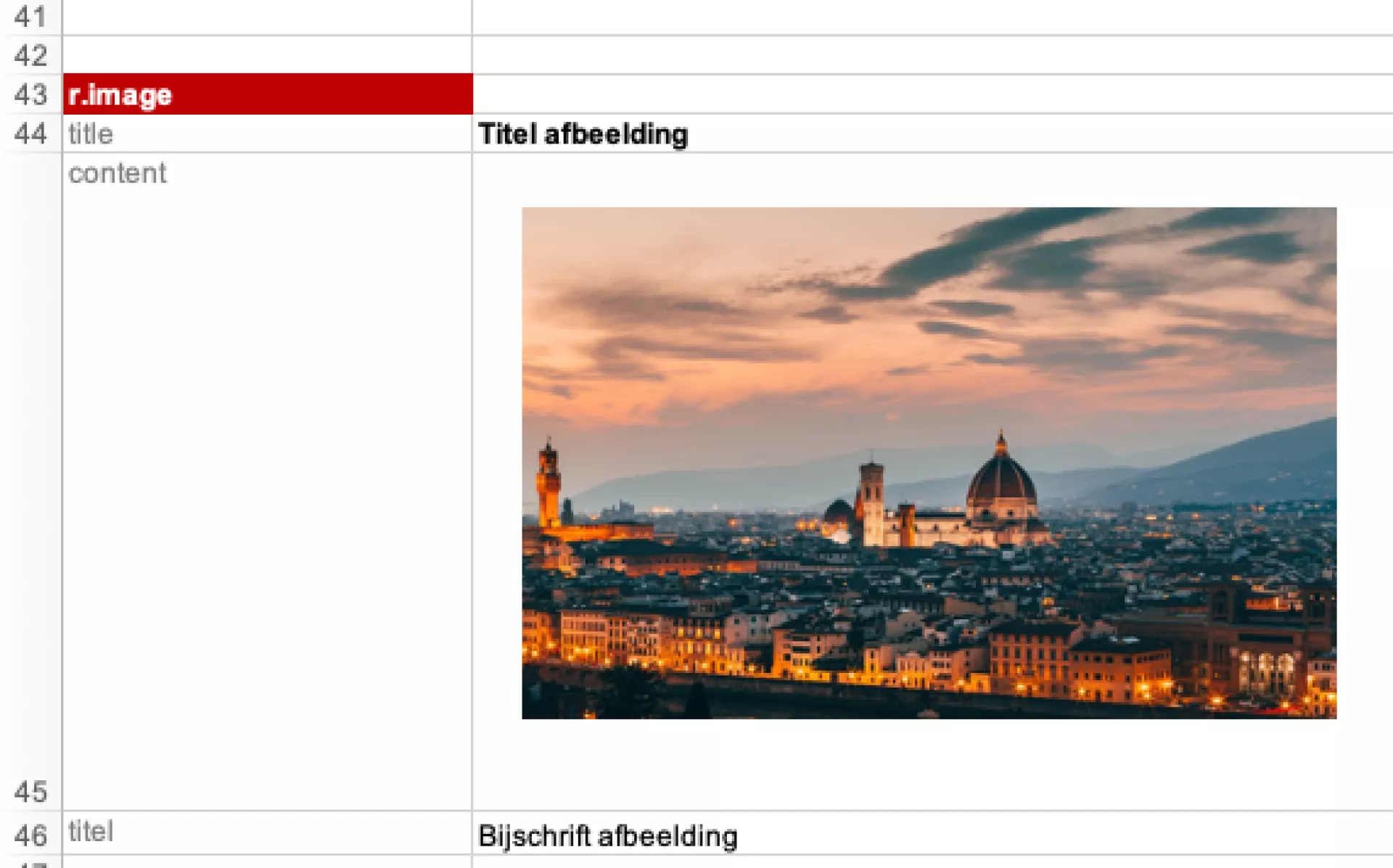 - content (of afbeelding): De afbeelding zelf, plak hiervoor een afbeelding in de cel van Excel
