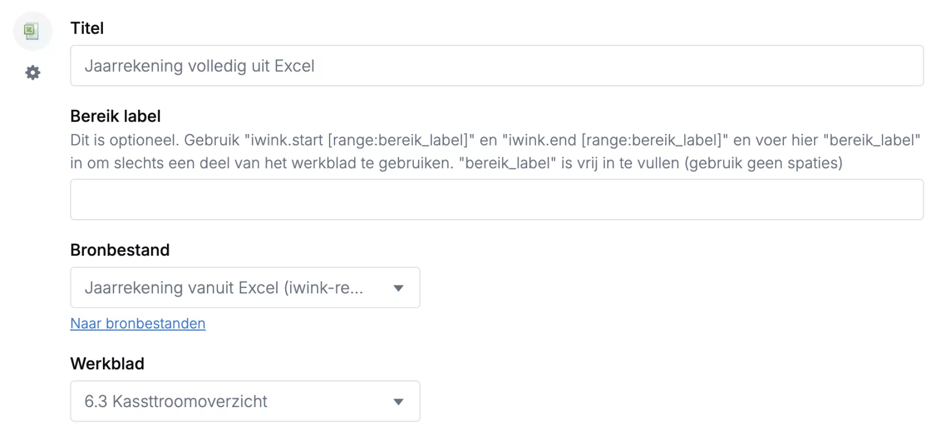Standaard gaat het Excel component ervan uit dat alle gegevens op een tabblad met iwink.report codering worden uitgelezen en getoond.