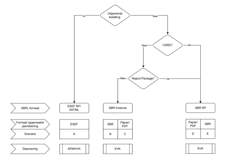 Of je voor D of E kiest heeft te maken met hoe jullie de opgemaakte jaarrekening ter controle en goedkeuring aanbieden aan de accountant/bestuur/RvT.Je kunt daar de .xbri file zelf gebruiken (stroom E) maar omdat de meeste mensen dat nog ingewikkeld vinden, kiest bijna iedereen voor stroom D (papier/PDF).