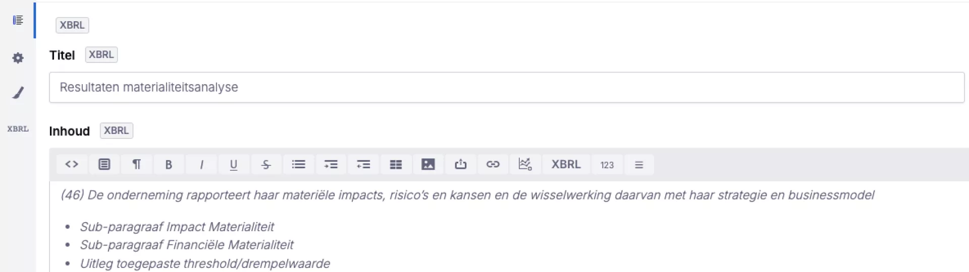 Om een onderdeel te taggen, klik je op de knop 'XBRL' bij het onderdeel dat je wilt taggen. Je vindt deze knoppen op verschillende plekken omdat je op verschillende niveaus kunt taggen, namelijk: