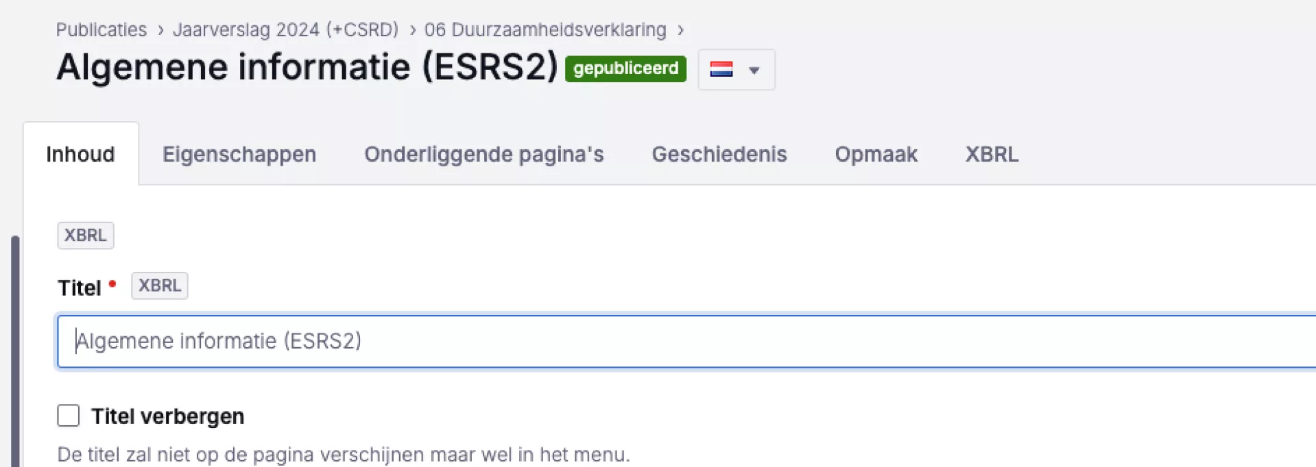 Om de getagde onderdelen te bekijken, gebruik je de XBRL-viewer. Deze zit aan de 'voorkant' van het verslag, maar is alleen zichtbaar als je bent ingelogd in het CMS.