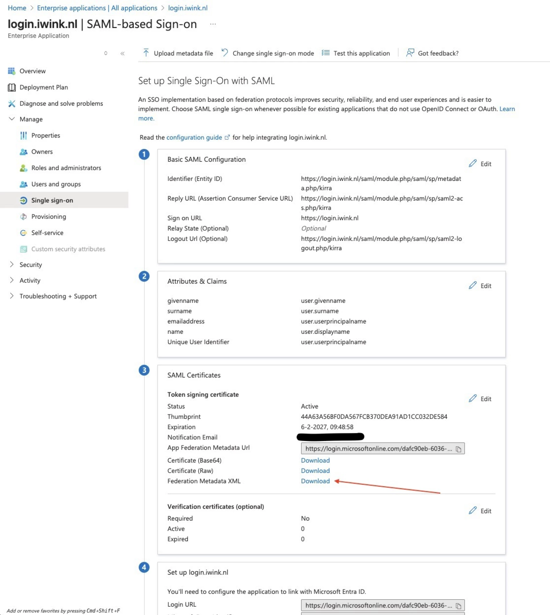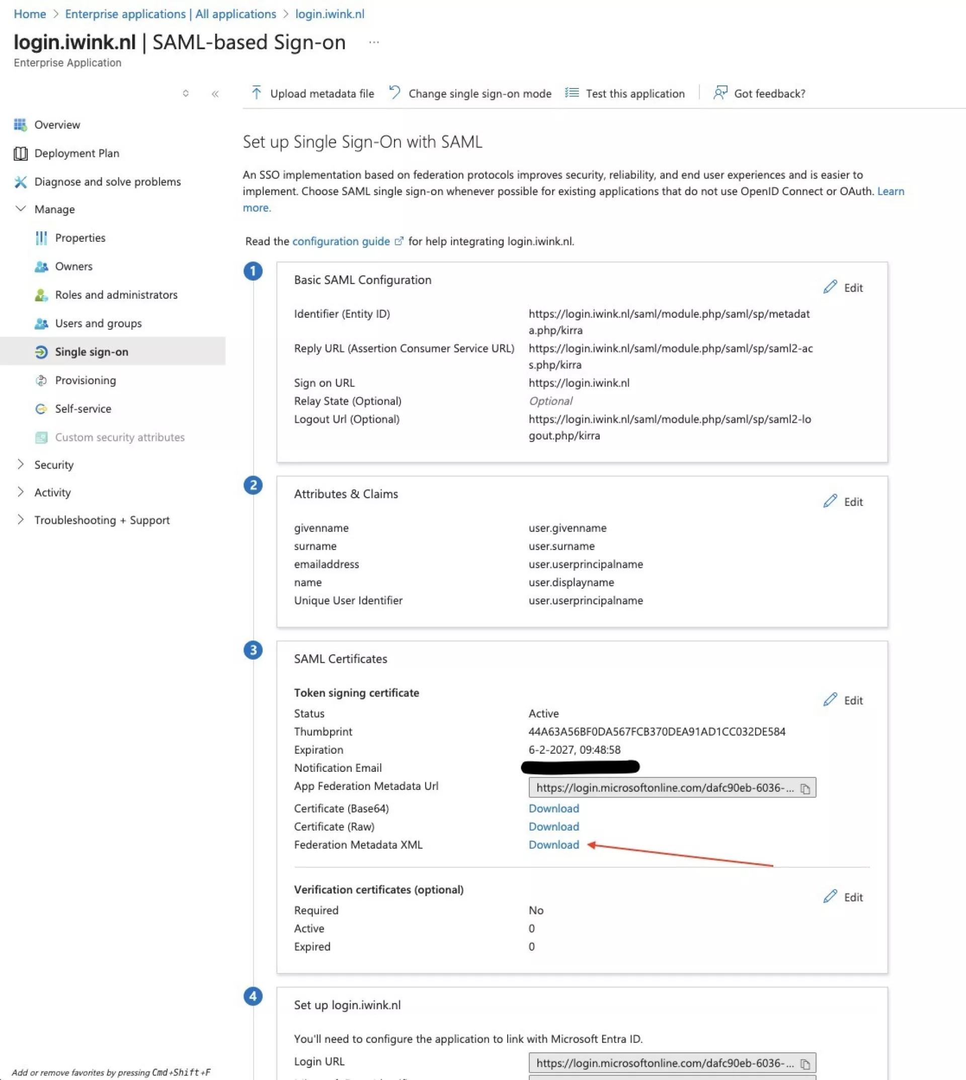 - Upload metadata file (download hiervoor dit bestand: https://login.iwink.nl/saml/module.php/saml/sp/metadata.php/kirra -> hernoem naar federationmetadata.xml voor upload)
