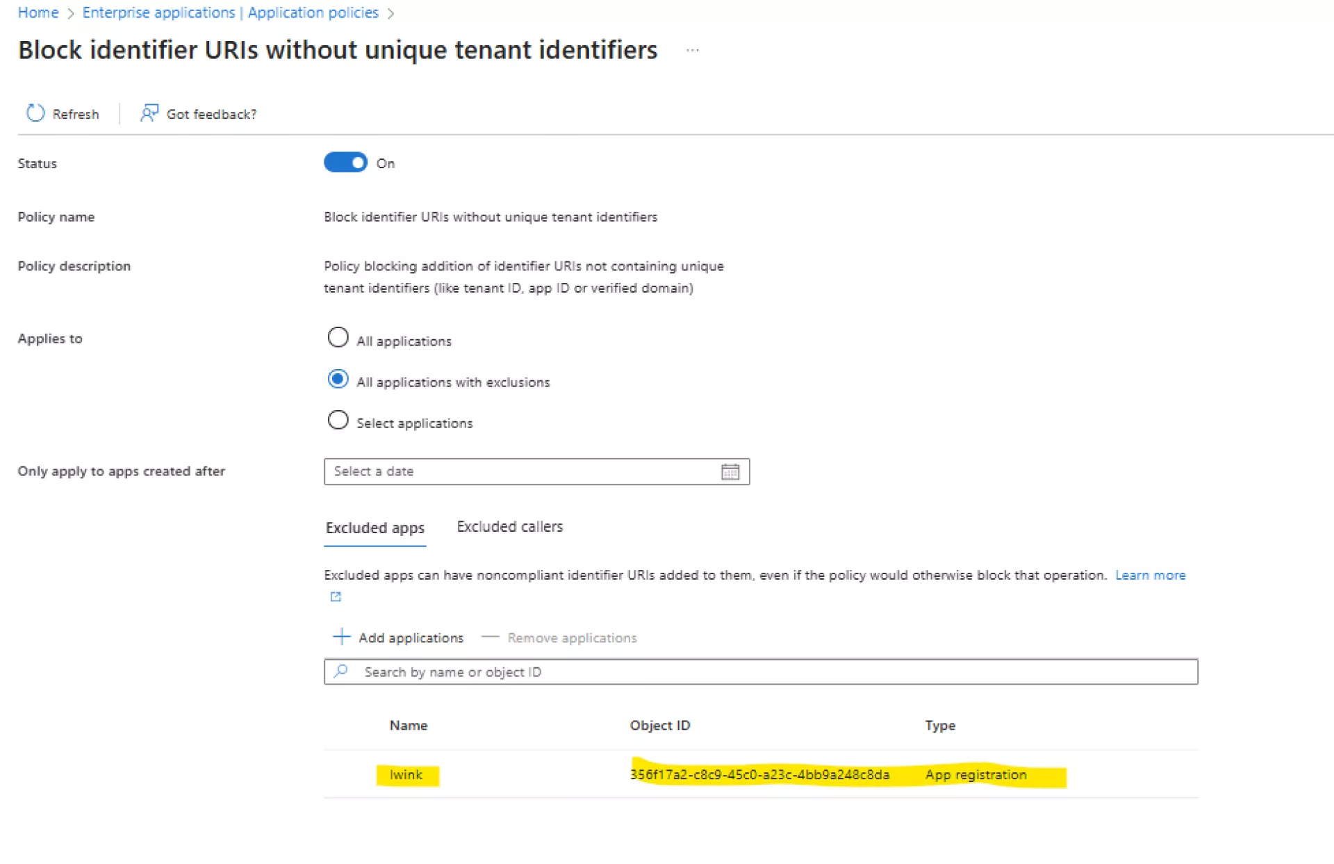 Block identifier URIs without unique tenant identifiers