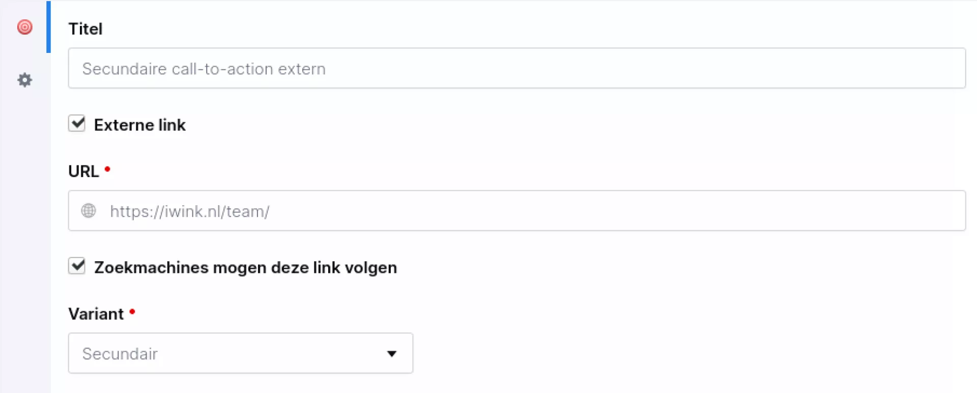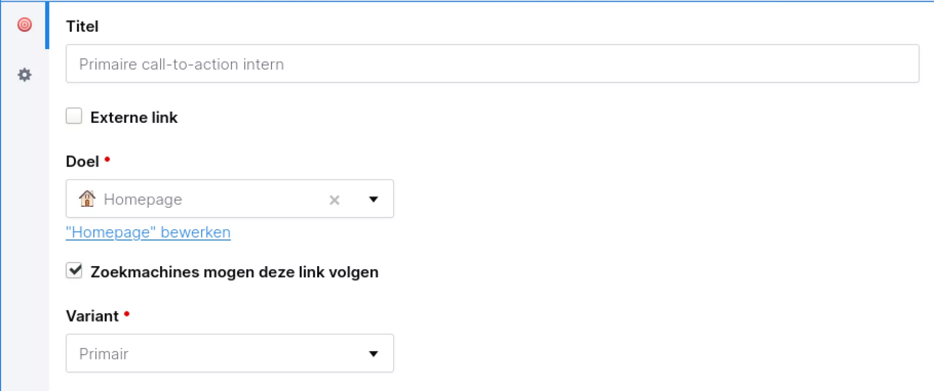 Voor de daadwerkelijke knop kun je zelf bepalen wat de tekst wordt. Daarnaast kun je aangeven of het een interne link is (dus binnen de website) of een externe link (dus naar een andere website).