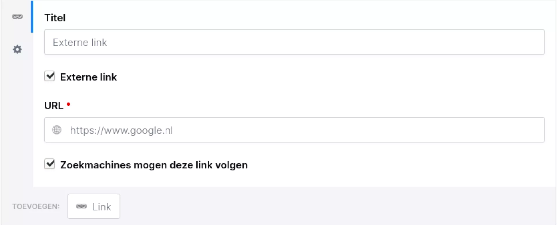 Om een knop te maken die naar een externe pagina (een pagina van een andere website) leidt, kun je "Externe link" aanvinken. Er verschijnt nu een invoerveld, waar je de link naar de externe pagina kunt invullen.