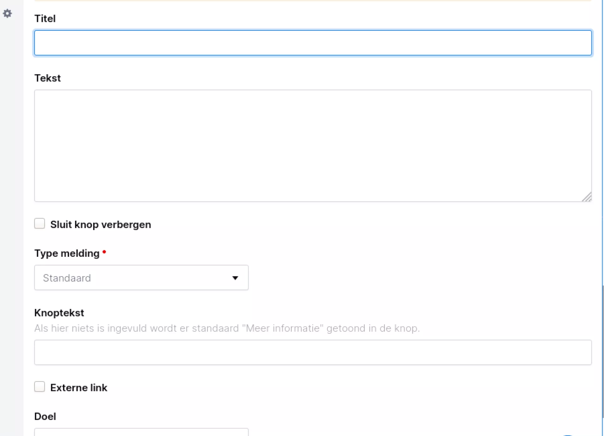 Deze component is beschikbaar als container component. Hierin kun je een titel en een tekst invullen. Daarnaast heb je ook nog de mogelijkheid om de sluit-knop te verbergen zodat een melding niet weggeklikt kan worden en altijd blijft staan.