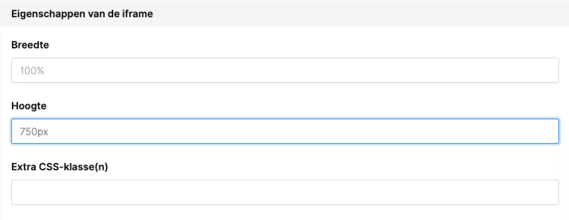 Breedte: deze staat standaard op 100%. Het is aan te raden om dit zo te laten staan, zodat het iframe netjes weergegeven wordt.