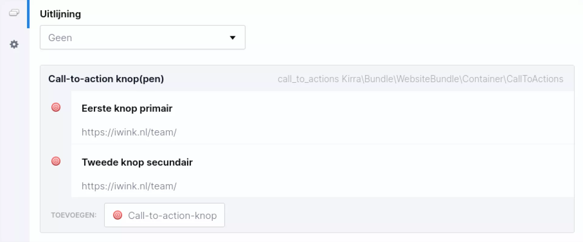 Onder "Uitlijning" kun je kiezen welke uitlijning je wilt. Daaronder kun je dan de call-to-action knoppen toevoegen. Deze kun je instellen als een normale call-to-action knop, zoals hier uitgelegd is.