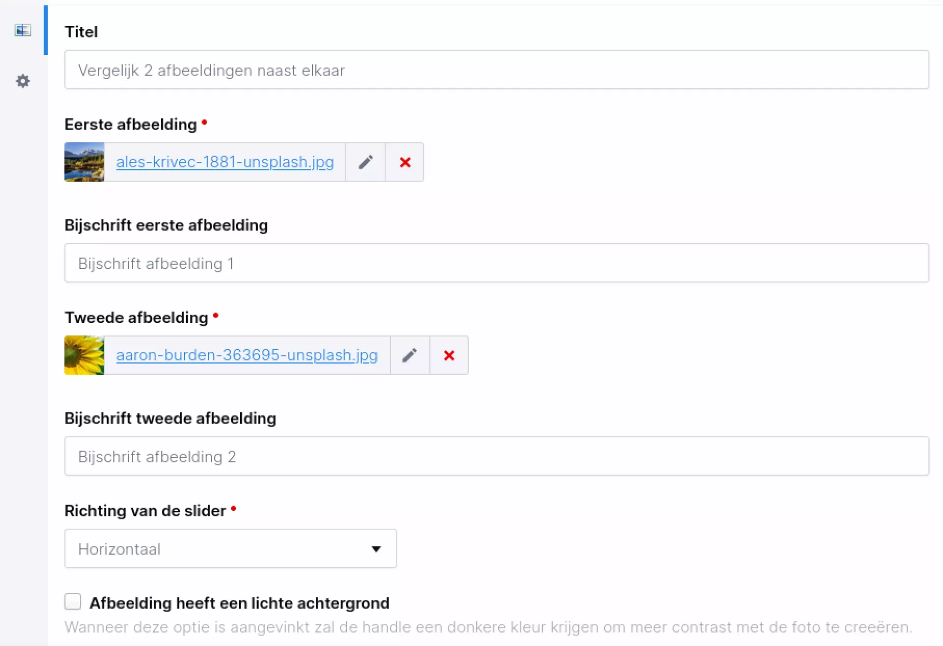 Standaard staan de afbeeldingen horizontaal ten opzichte van elkaar. Dit kan met een checkbox in het CMS ook verticaal worden getoond. Ook is er een checkbox beschikbaar om aan te geven dat de afbeeldingen licht zijn. Hierdoor wordt de sleepbalk donkerder weergegeven.