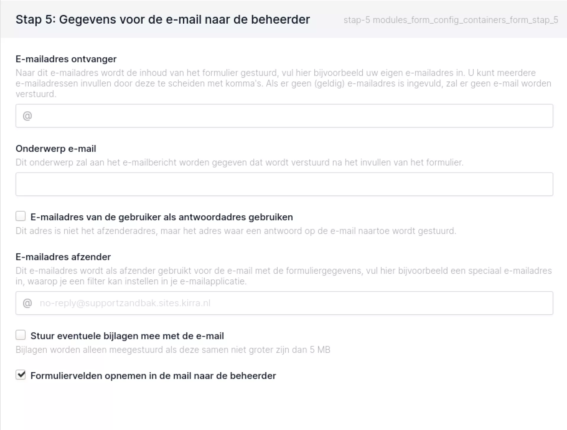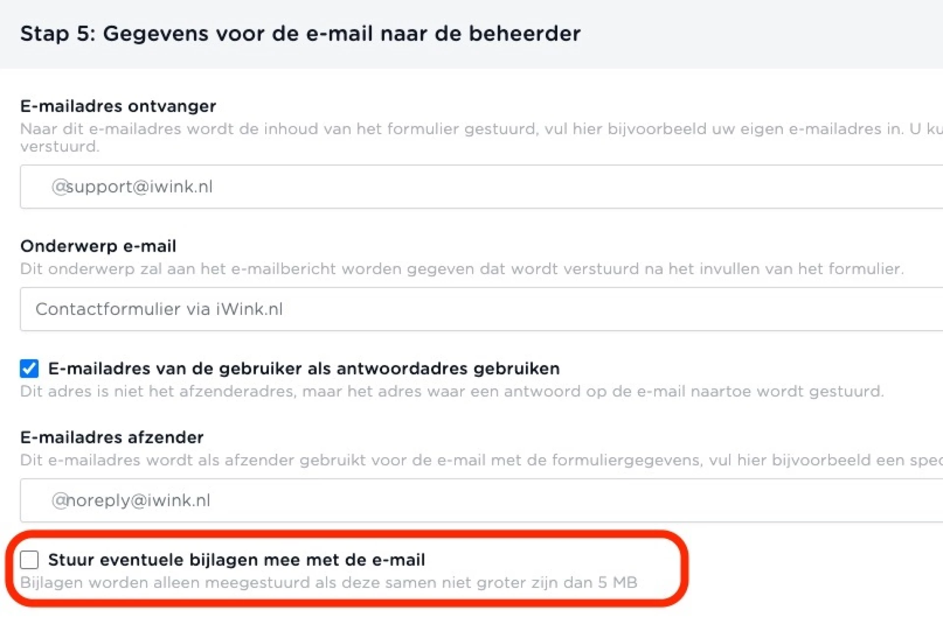 1. In "Stap 5: Gegevens voor de e-mail naar de beheerder", kun je "Stuur eventuele bijlagen mee met de e-mail" aanvinken (zie de afbeelding hieronder). Daarmee ontvang je dus de bijlagen die bij een formulierinzending toegevoegd worden. Hiermee kun je niet met terugwerkende kracht eerder verzonden bijlagen opvragen.
