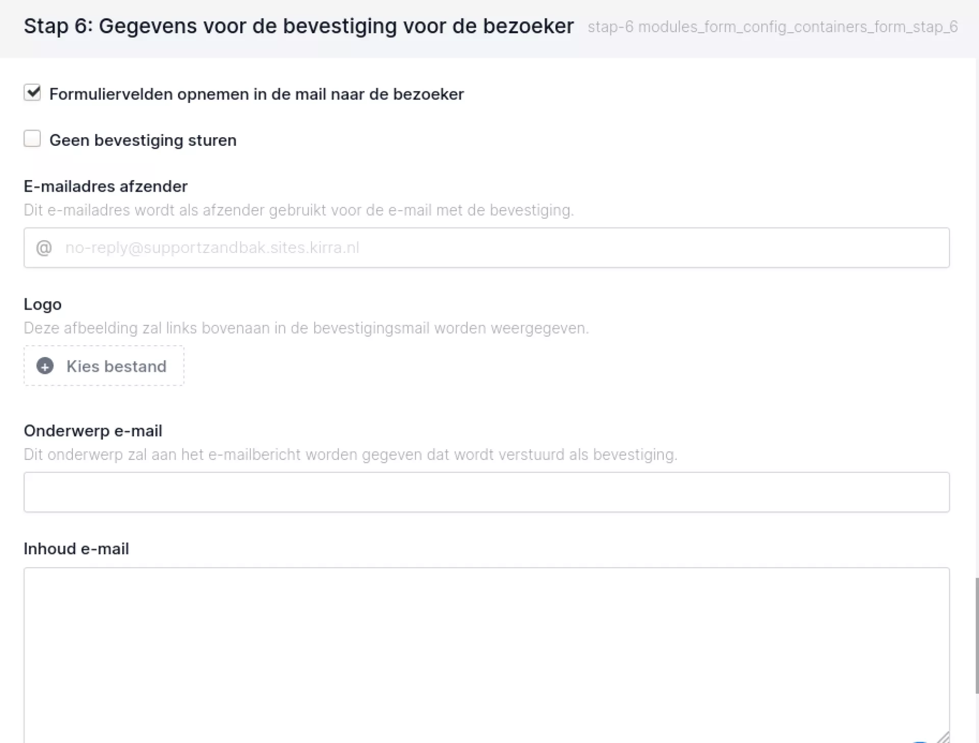 Stap 6 gebruik je voor de e-mail die de bezoeker als bevestiging kan krijgen. Je geeft hier aan wat er precies in de mail moet staan. Je kunt daarbij ook een logo toevoegen en het e-mailadres instellen wat als afzender wordt gebruikt voor de bevestigingsmail. Mocht je niet willen dat de bezoeker een bevestiging krijgt, dan kun je dat hier ook aanvinken.
