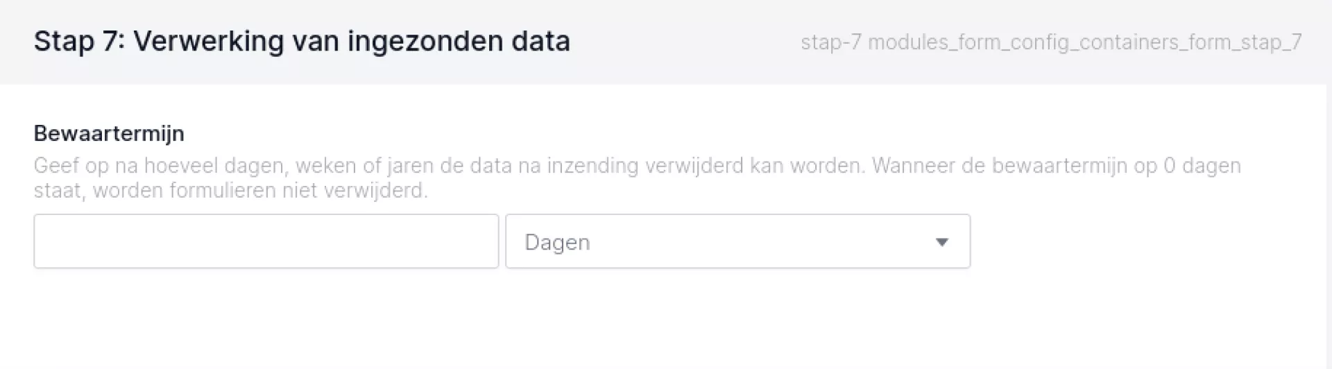 In stap 7 kun je opgeven hoe lang gegevens bewaard moeten worden. Dit kan handig zijn in het kader van de AVG/GDPR. Als je niets invult, worden de gegevens nooit verwijderd.