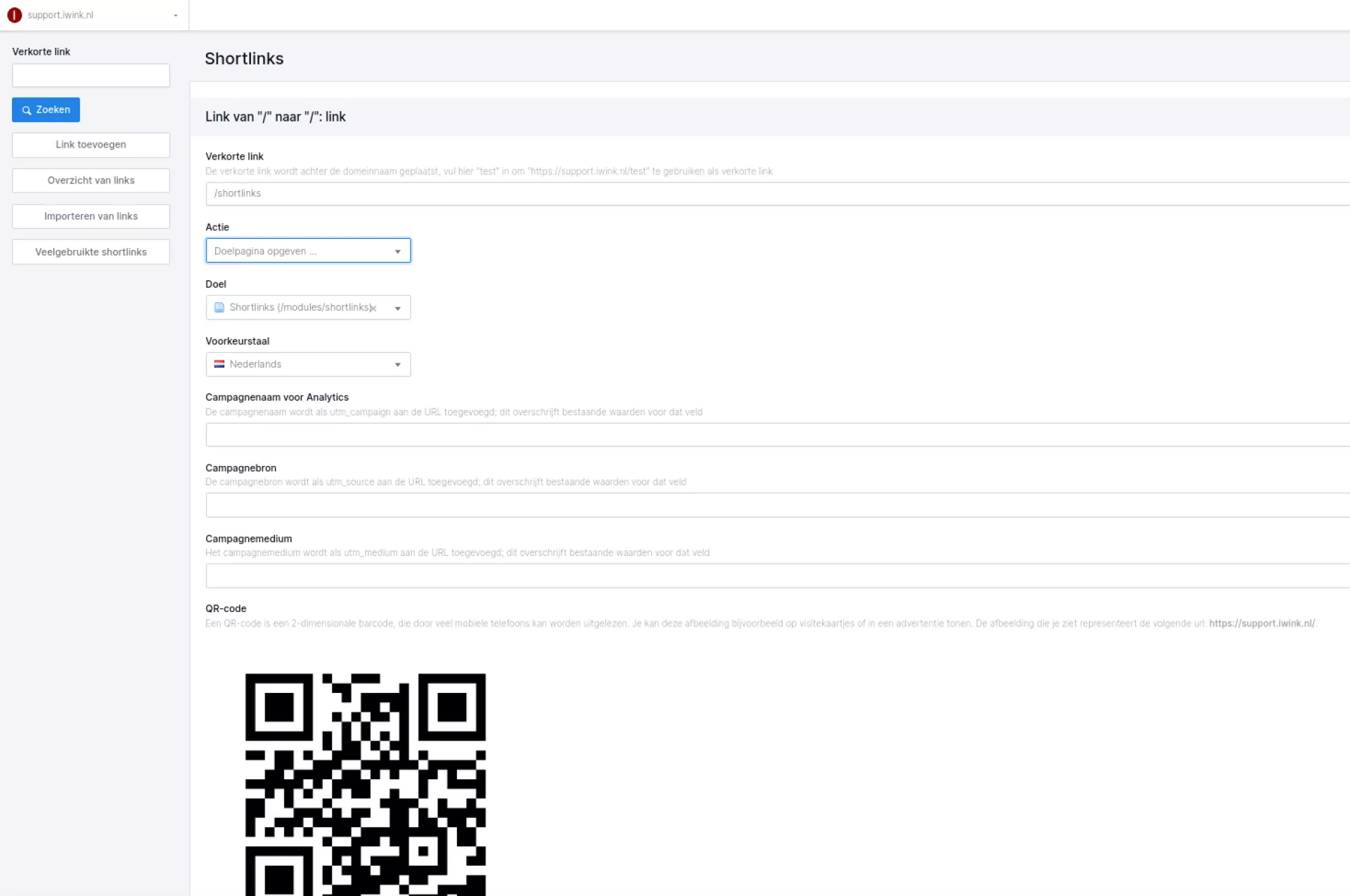 Soms wil je alleen een QR-code maken voor een bepaalde link. Let er dan op dat een shortlink niet gelijk kan zijn aan de link van de pagina naar toe leidt. Een shortlink naar, bijvoorbeeld, https://www.iwink.nl/contact kan dus niet https://www.iwink.nl/contact zijn.