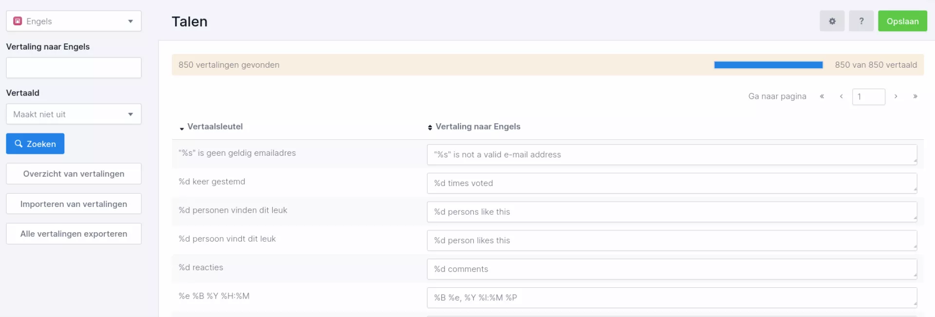 Wil je bijvoorbeeld een term 'Zoeken' vertalen naar het Engels, dan kies je linksboven voor de optie "Engels" en zoek je vervolgens op de term "Zoeken". Hier kan hij vervolgens in de rechterkolom vertaald worden naar "Search".