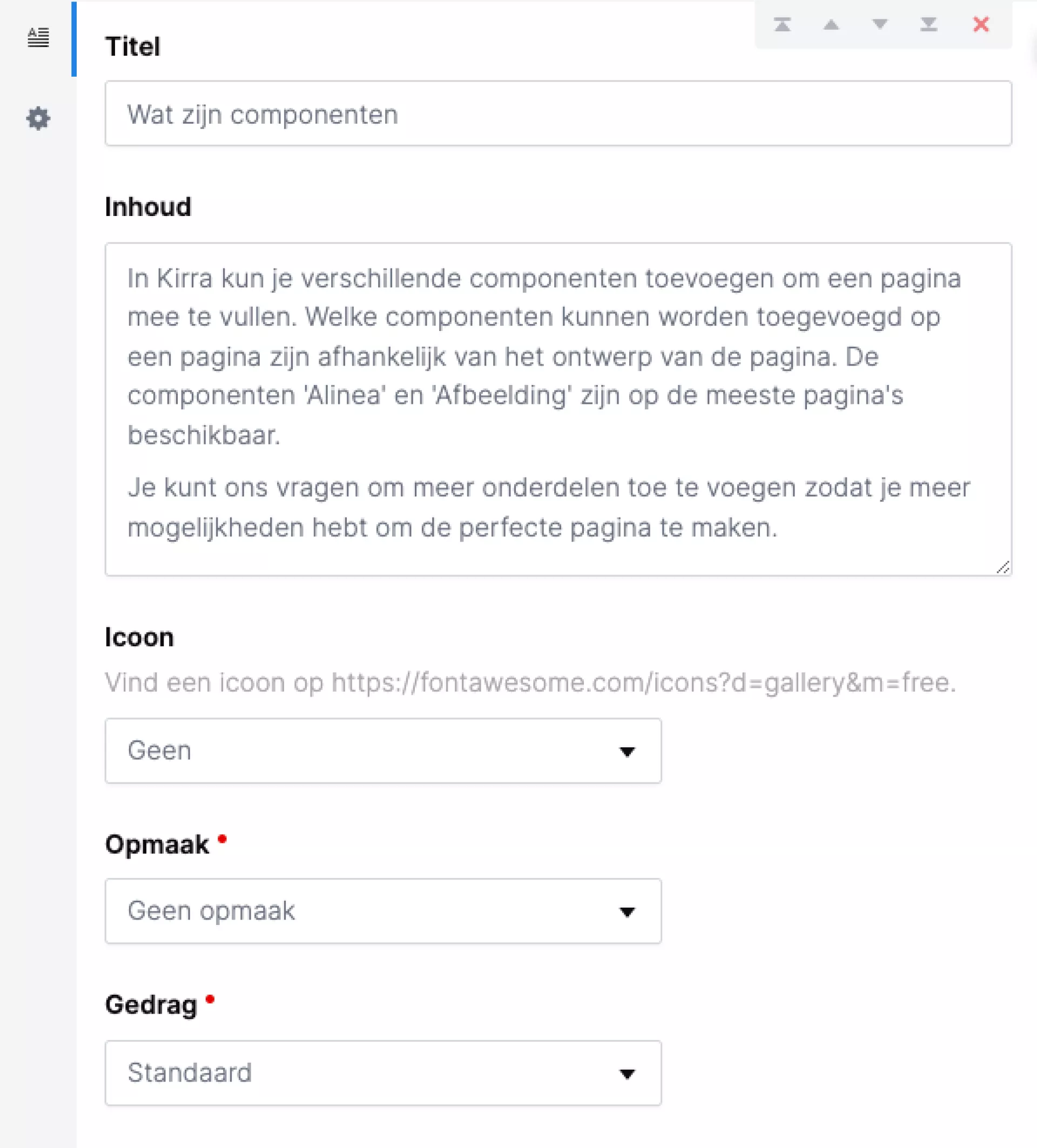 Ook kun je de pijltjes gebruiken die je rechtsboven in de component ziet wanneer je met de muis over de component beweegt. Zie ook het screenshot hiernaast waar je deze pijltjes precies vindt.