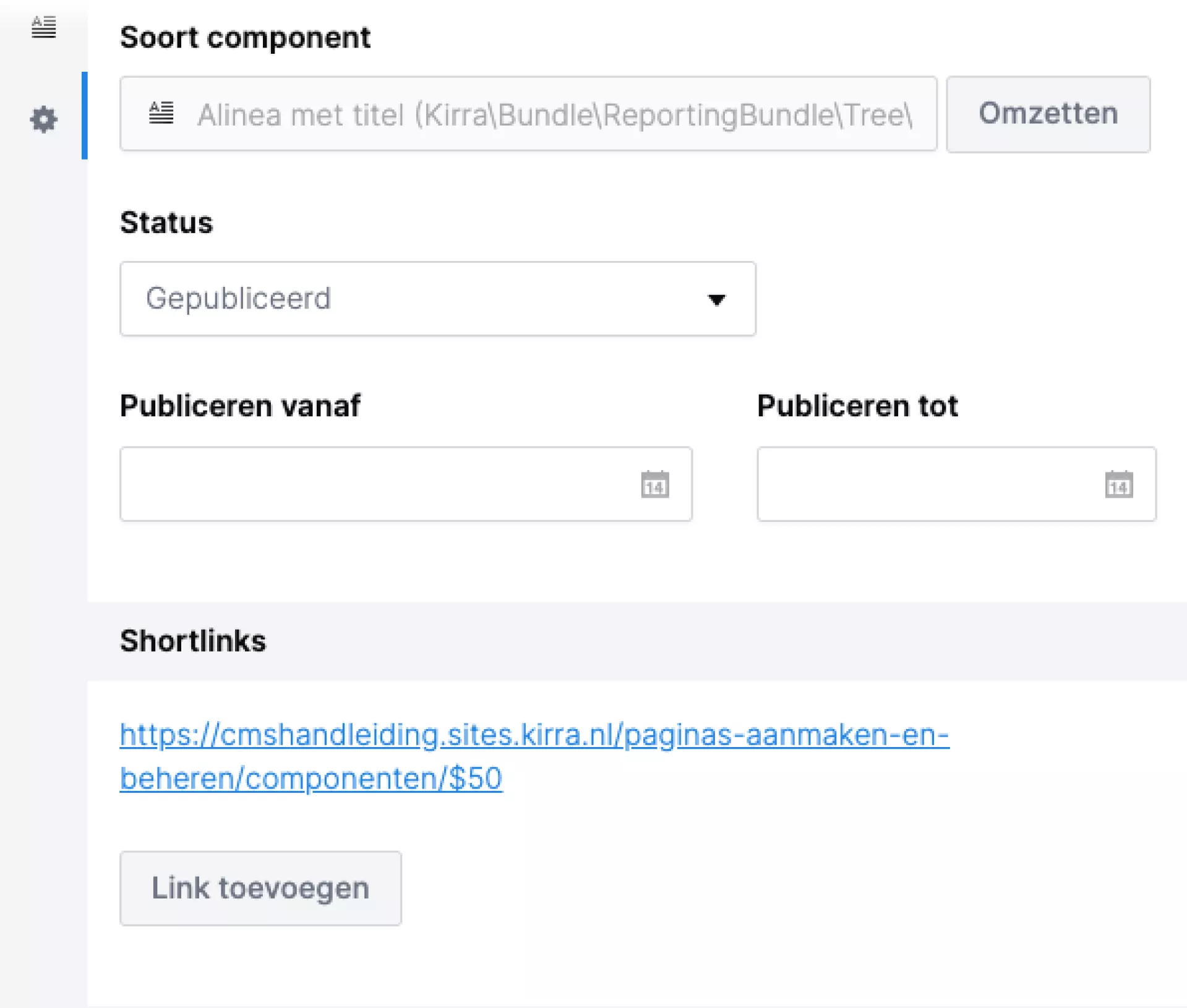 Klik je op een component, dan zie je de inhoud van deze component. De inhoud van een component vul je in de velden. De velden verschillen per component. Zo zie je vaak velden om een titel, tekst of een link op te kunnen geven. Soms komt het ook voor dat er componenten zijn met een container. Daarbinnen kun je dan ook weer componenten toevoegen. Zoals bijvoorbeeld bij een "Lijst met links".