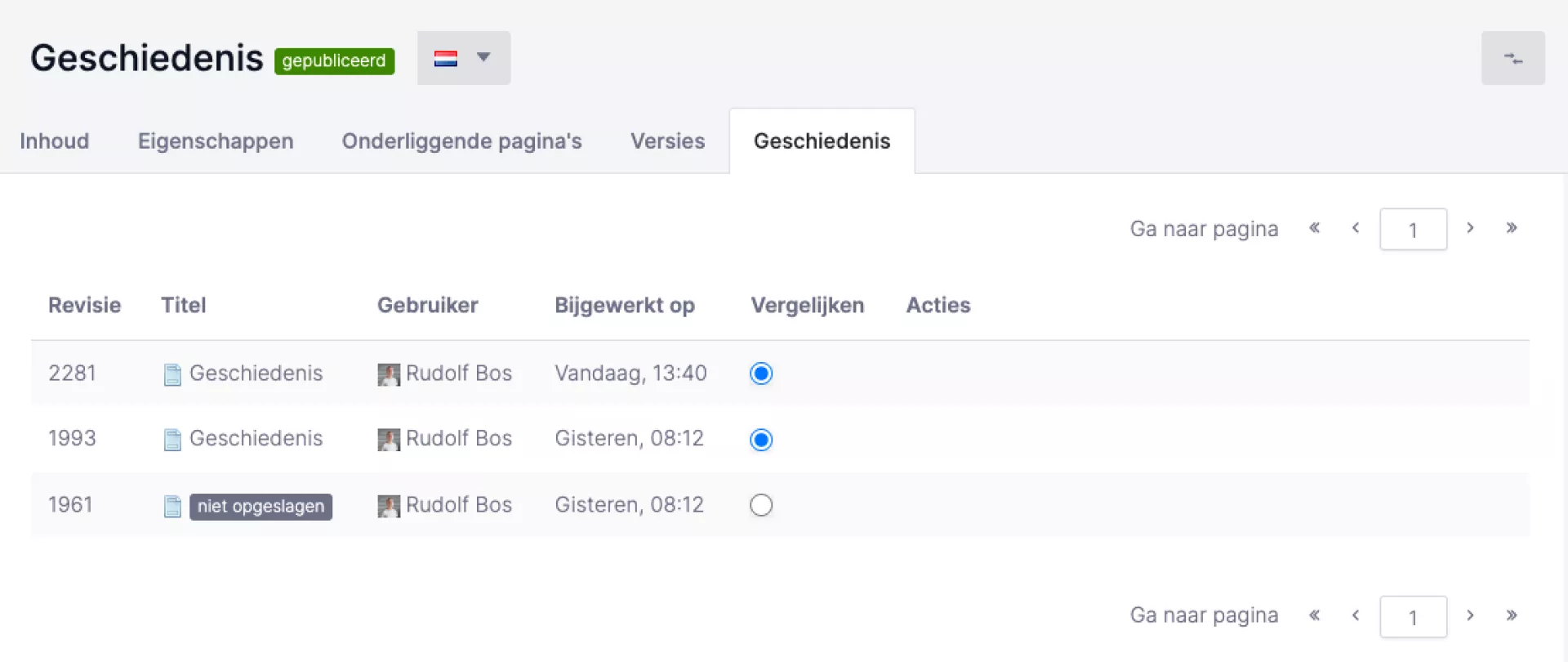 In de loop van de tijd zul je diverse wijzigingen aan een pagina aanbrengen. Als deze wijzigingen worden door het CMS opgeslagen en zijn terug te vinden onder het tabblad 'Geschiedenis'. In de foto hieronder zie je de geschiedenis van deze pagina: