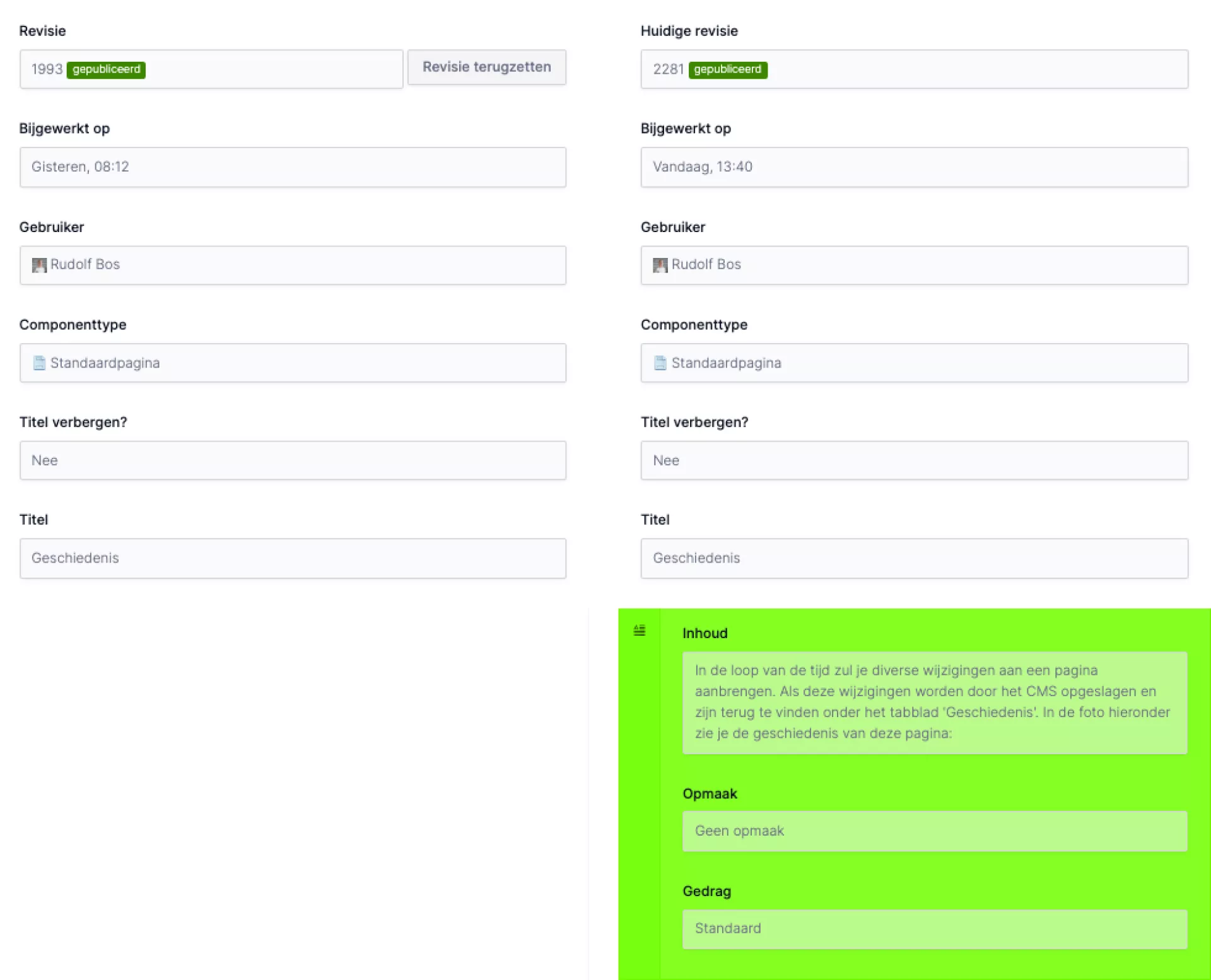 De laatste versie zie je in de linkerkolom. Rechts zie je de wijzigingen die daarna zijn gedaan. Aan de linkerkant zie je dat er niks onder "Inhoud" staat. Aan de rechterkant zie je dat er onder "Inhoud" een alinea staat en dat dat veld groen is. Dit overzicht laat zien dat er onder "Inhoud" een wijziging plaats heeft gevonden.