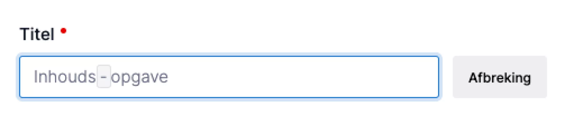 De titel kun je afbreken op lettergrepen zodat in alle browsers en voor alle resoluties het woord passend gemaakt kan worden. Dit is met name handig om te voorkomen dat lange woorden buiten beeld lopen. Plaats je cursor op de plek waar je het woord wilt afbreken en druk dan op de knop "Afbreking". Je ziet dan een grijs omkadert streepje. Dit streepje zie je standaard niet terug op de voorkant tenzij het woord afgebroken moet worden. De browser zal dit dan doen op de aangegeven plekken. Het is aan te raden om deze tekens tussen de lettergrepen toe te voegen.