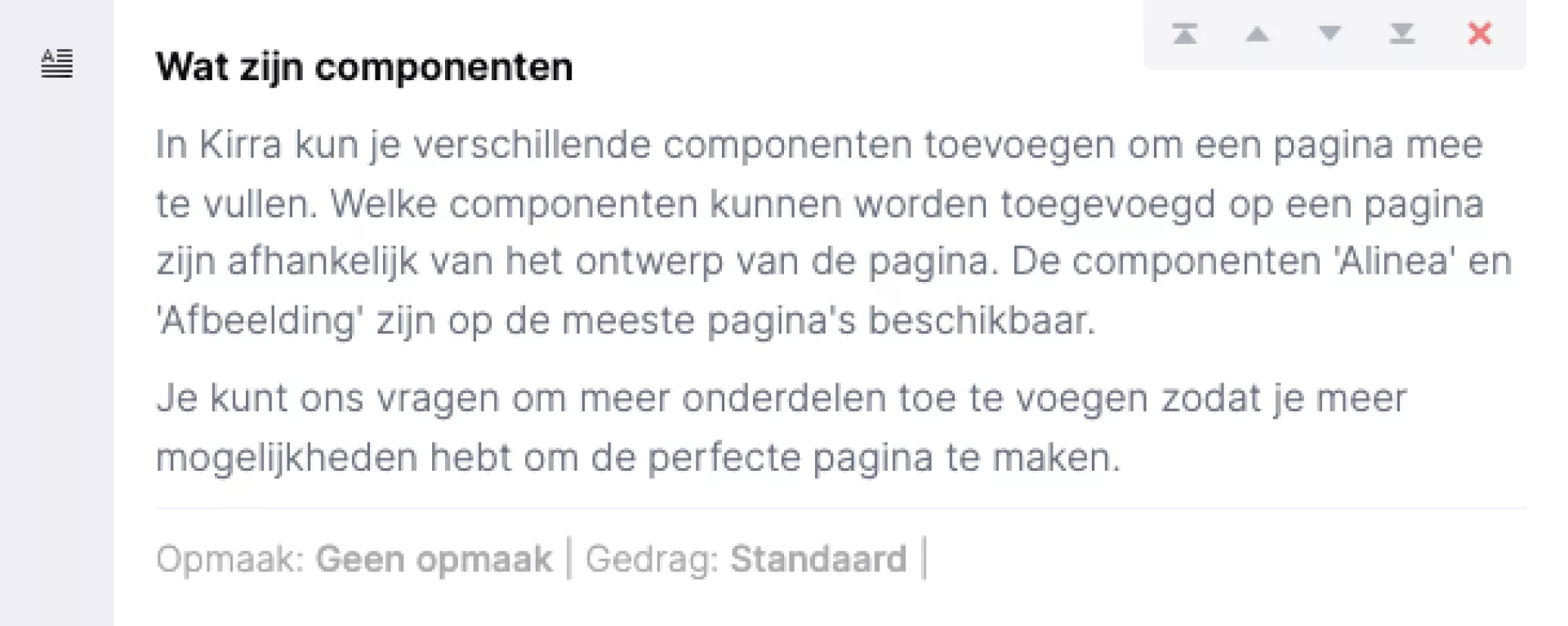 In Kirra kun je verschillende componenten toevoegen om een pagina mee te vullen. Welke componenten kunnen worden toegevoegd op een pagina zijn afhankelijk van het ontwerp van de pagina. De componenten "Alinea" en "Afbeelding" zijn op de meeste pagina's beschikbaar.