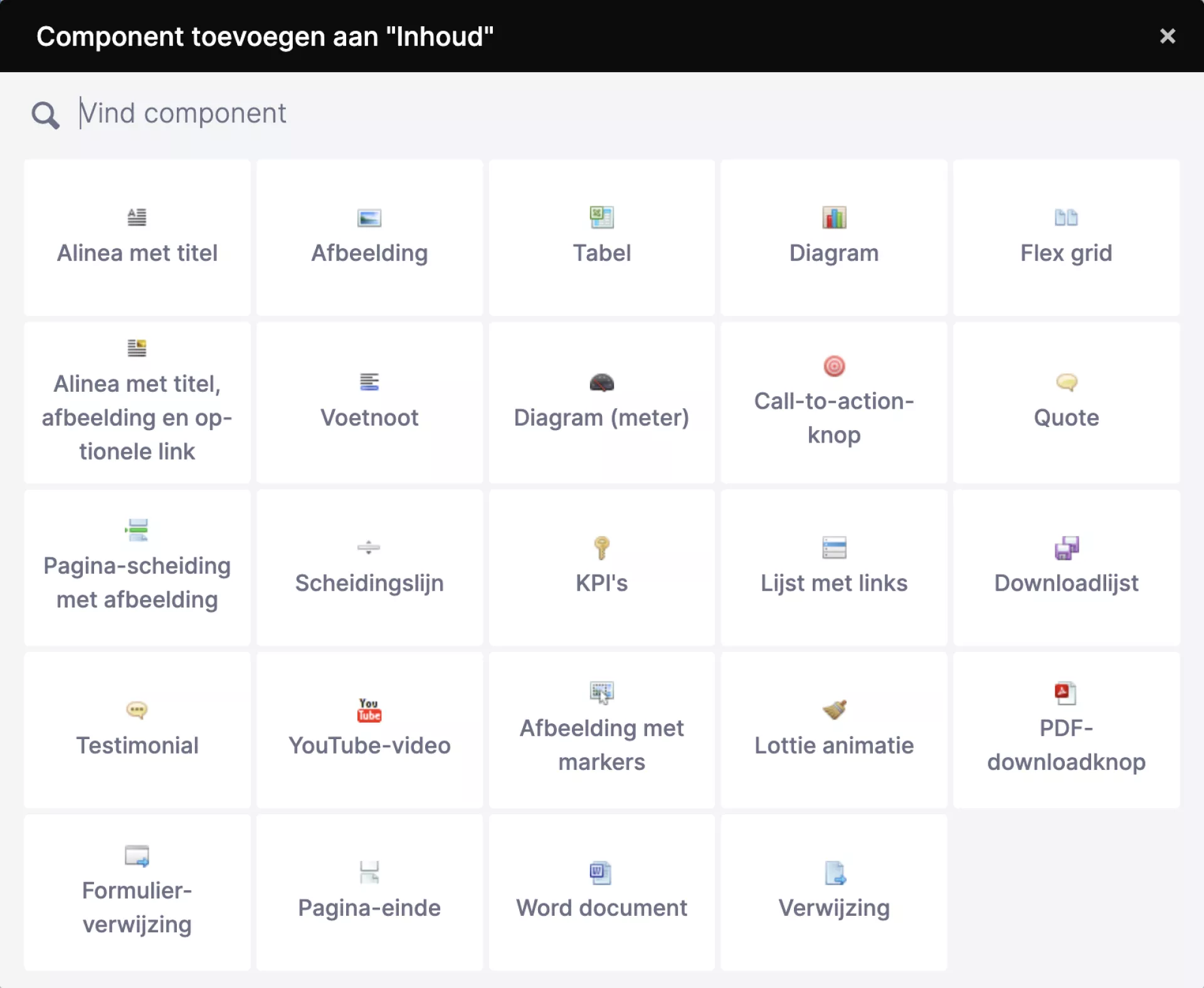- Containers: In containers kun je inhoud vullen die meerdere keren voor kan komen. Denk bijvoorbeeld aan meerdere paragrafen met tekst of afbeeldingen. In deze sectie lees je meer over het toevoegen van container-componenten.