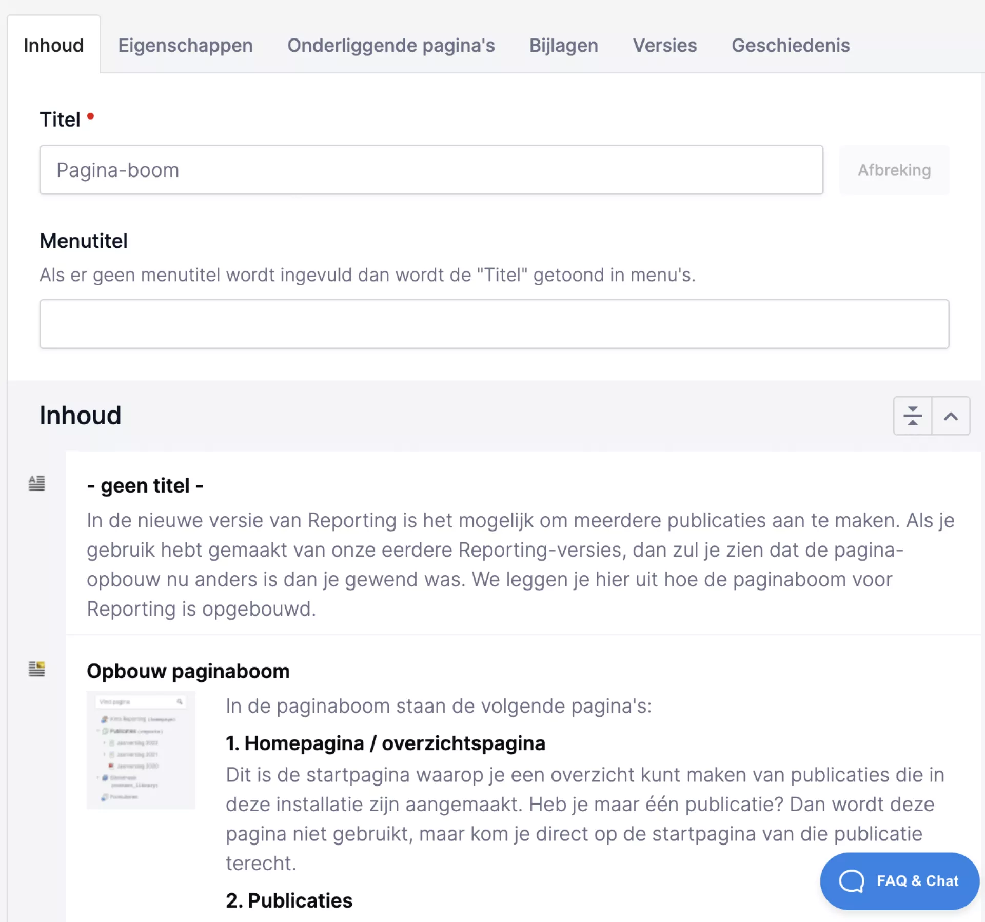 - Je kunt hier nu naar hartelust aan de slag en het voorbeeld bekijken (blauwe oog-icoon in het actiemenu), terwijl de bezoeker nog de oudere inhoud ziet