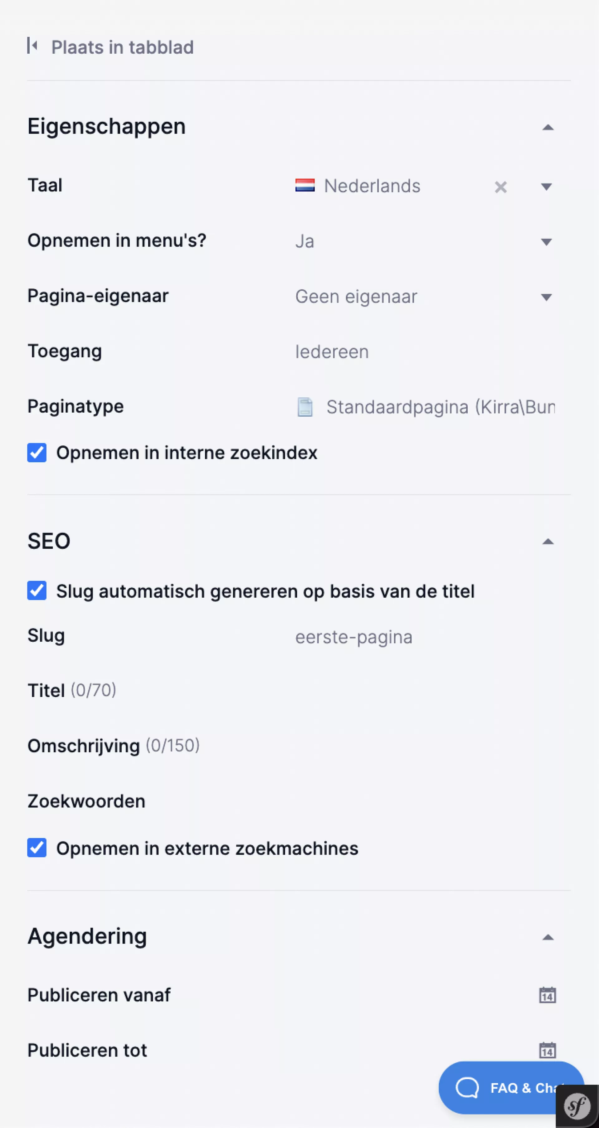 Met de optie "Agendering" kun je aangeven of de pagina vanaf een bepaalde datum op de website zichtbaar moet zijn (Publiceren vanaf) of na een bepaalde datum niet meer getoond moet worden (Publiceren tot). Handig als je bijvoorbeeld op vrijdag een pagina wilt klaarzetten die eigenlijk direct na het weekend live moet staan. Wanneer je hier niks invult, wordt de pagina getoond zodra je op 'publiceren' klikt en blijft deze zichtbaar totdat je de pagina op "offline" zet.