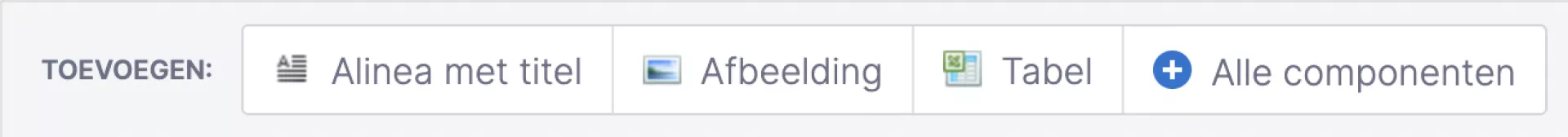 Onderaan elke container vind je drie knoppen met de meest gebruikte componenten. Klik op één van deze knoppen om de component direct onderaan je pagina toe te voegen.